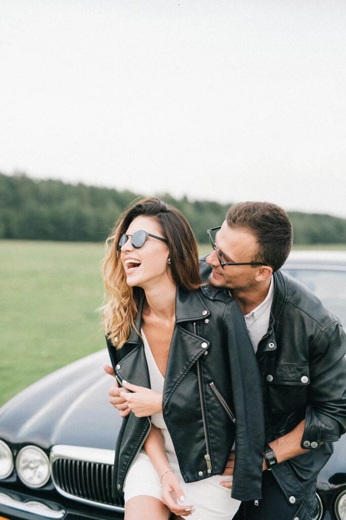 A happy couple standing in front of a car