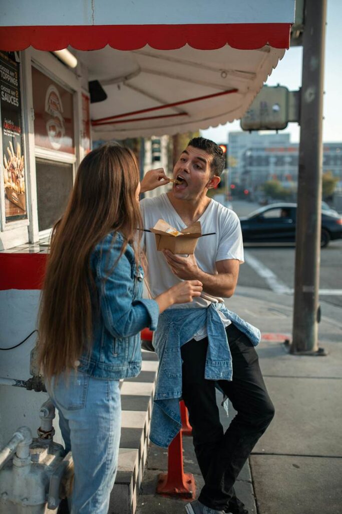 A woman feeding a man holding a takeout box