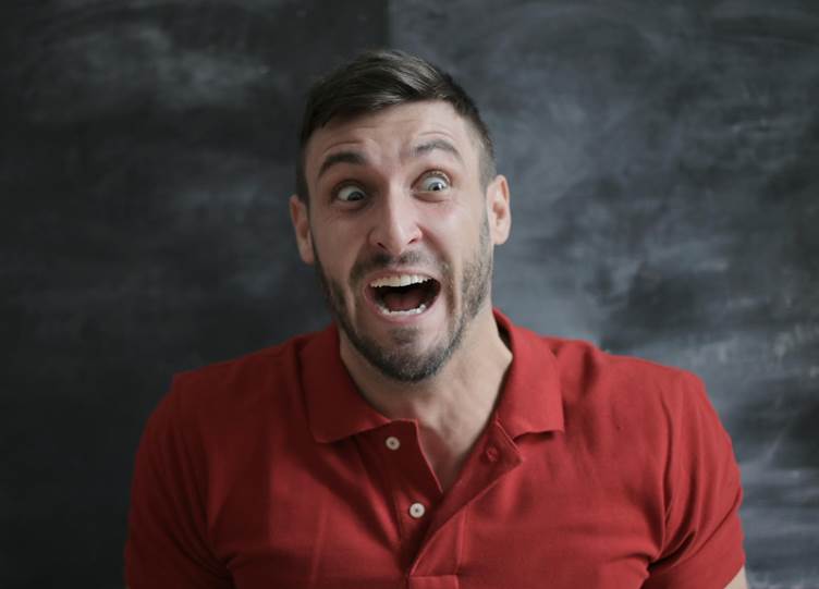 A man in a red shirt looking surprised and scared