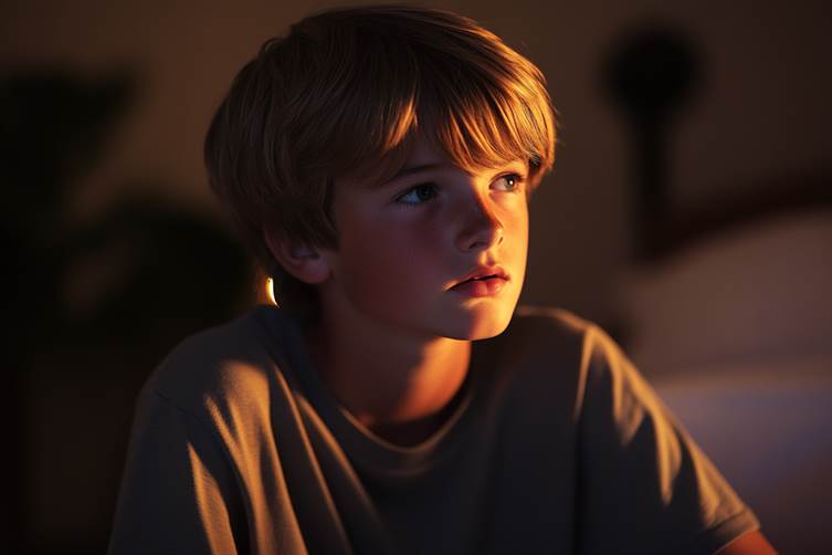 A boy sitting in a living room, looking down | Source: Midjourney