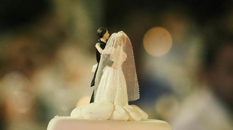 A bride and groom cake topper on a wedding cake | Source: Pexels