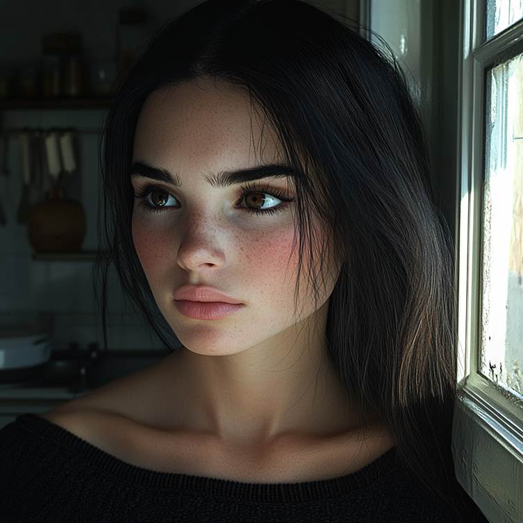 A heartbroken woman standing near the kitchen window | Source: Midjourney