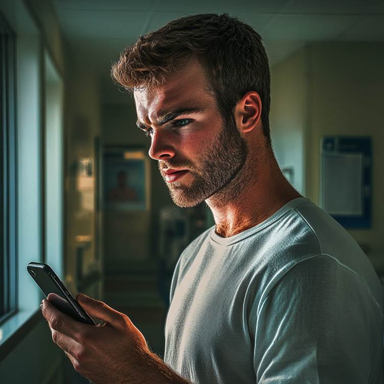 An anxious man holding a phone in a hospital | Source: Midjourney