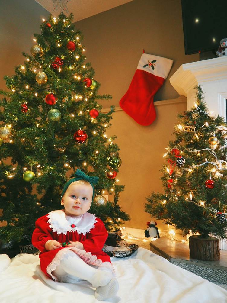 A baby girl sitting against the backdrop of Christmas decorations | Source: Unsplash