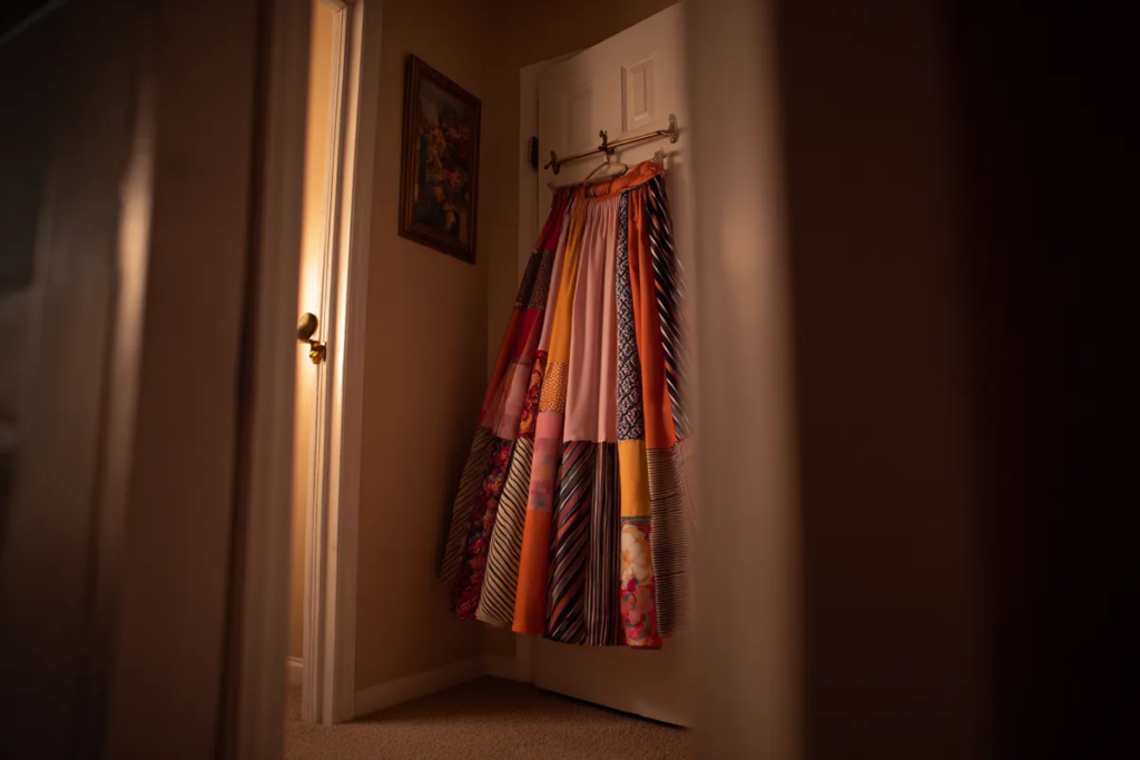 By 6 p.m., I was ready. I stood in front of my mirror one more time, and the skirt gleamed under my bedroom light. Blues, reds, and golds caught the rays like pieces of stained glass. I carefully pinned one of Dad’s old cufflinks to the waistband as a final touch.